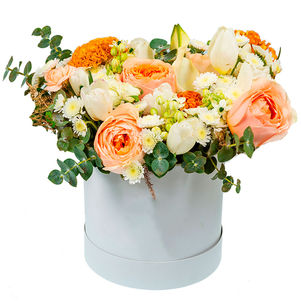 Роза одноголовая пионовидная, тюльпан, ромашка кустовая, эвкалипт, целозия, зелень.