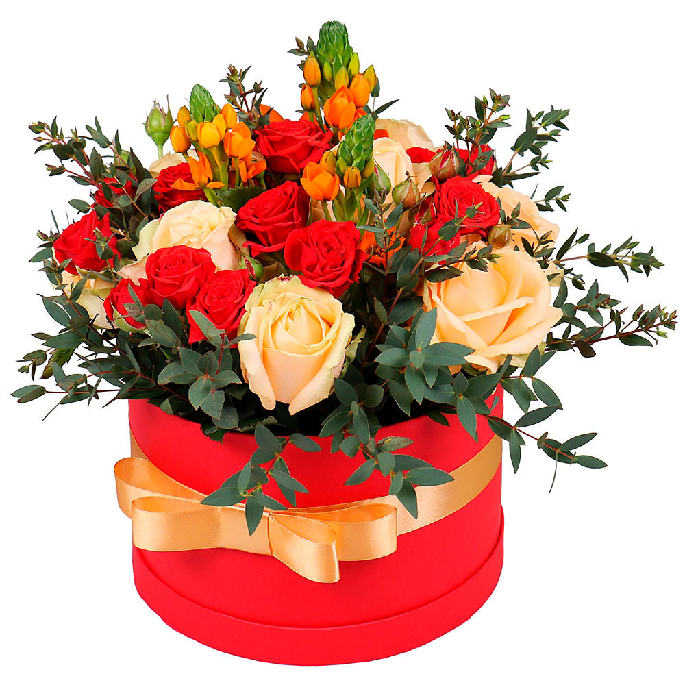 Роза одноголовая, роза кустовая, орнитогалум, эвкалипт.