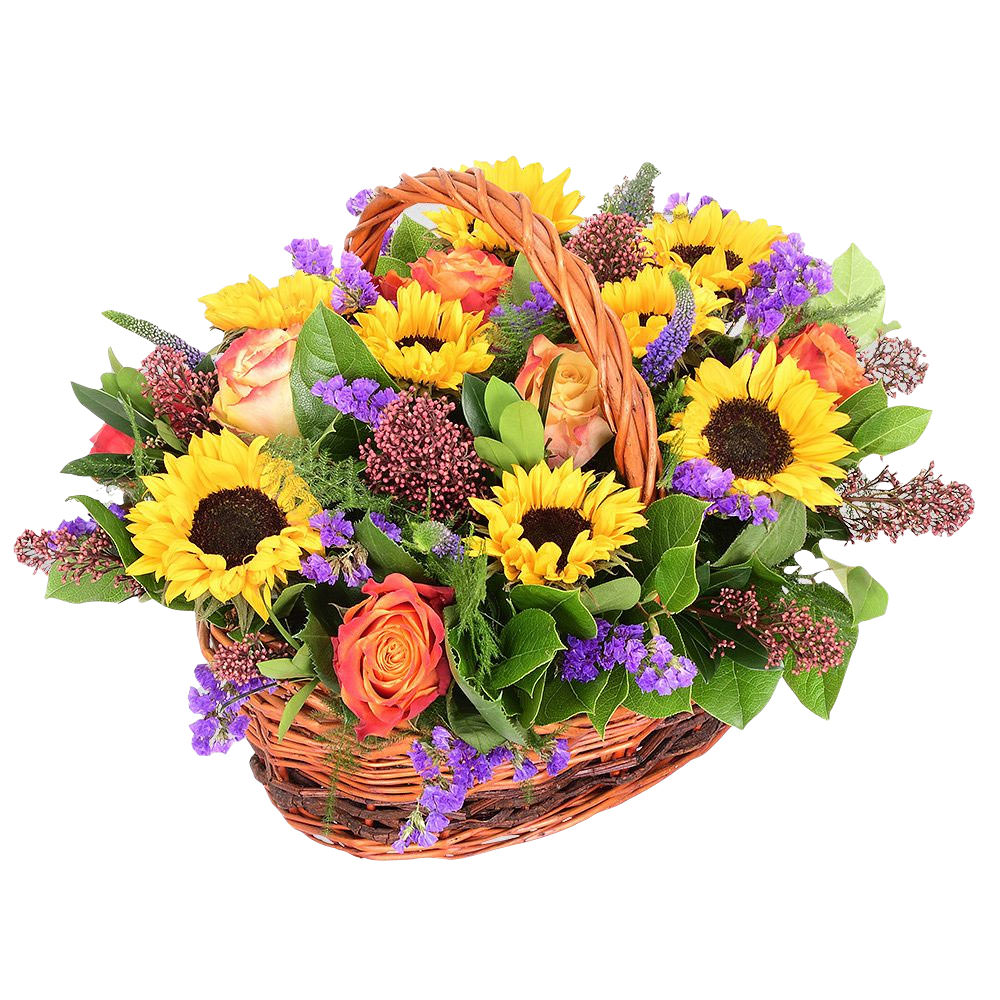 Роза, подсолнух, вероника, статица, скимия, зелень.